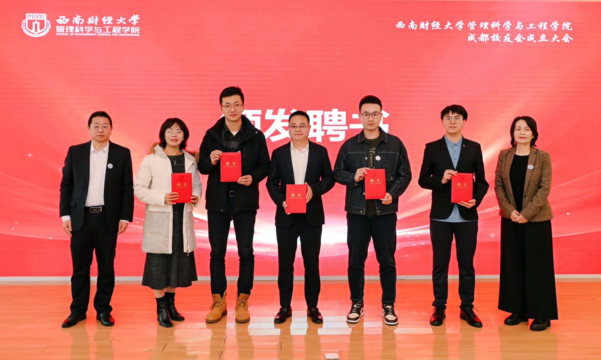 成都校友会第一届机构成员名单,学院党委书记周敏和院长鲁万波为机构成员颁发聘书。