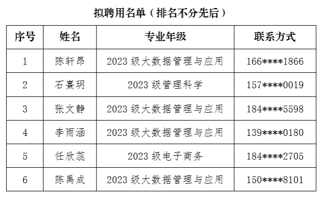 经自主报名、资格初审、面试选拔,学院研究决定以下6名同学为学院2024级本科新生助理辅导员拟聘用人选,现予以公示,公示期为3个工作日。